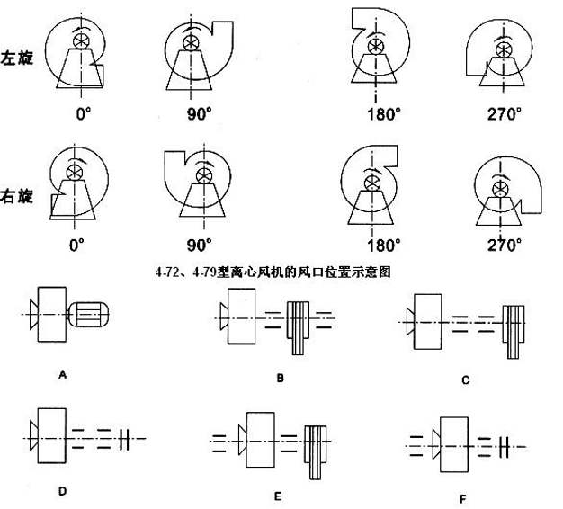 風機分左旋和右旋兩種型式,從電機(皮帶輪)側正視,葉輪按順時針方向旋轉為右旋,逆時針旋轉為左旋。A式為點擊直聯(lián)傳動。B、C、E式為皮帶傳動,D、F式為聯(lián)軸器傳動。